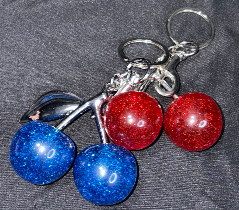 Red and blue cherry silver key chains